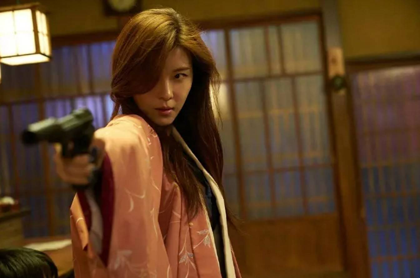 参与到动作戏的还有两个人物,那就是河智苑和戚薇。戚薇作为片中的一个人畜无害的小白兔式人物拿枪不怯也算是大姑娘上轿头一回;重点在河智苑饰演的女杀手,她跟她的搭档在电影开头就来了一场日本小酒馆大屠杀,一群老爷们任这对儿姐妹花突突,当然中间也要有一些甩头、空翻、凌波微步这些美学动作,所以开头的一场戏成功做到了放大商业卖点,成功吸睛。