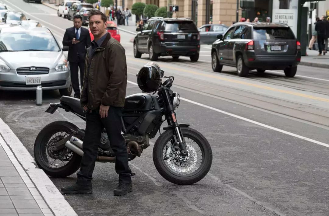 但埃迪身体好,毒液上了他的身后俩人一拍即合成了好基友,虽然也有前期的身体磨合的过程,比如说毒液爱吃的活的生的,埃迪就得给他去捞龙虾。可以说在漫威所有的超级英雄中,毒液是口味最重的一个,死侍毕竟也只是耍耍嘴炮,这个是上来就嗑人脑浆子。一言不合就玩跳楼机这让宿主埃迪也是心脏受不了。片中的一段飙车戏,摩托车被开成了过山车,埃迪的表情都要崩溃了。也难为了他的扮演者汤姆·哈迪了,一直以来人们心目中的硬汉形象,啥时候怕过事儿啊!