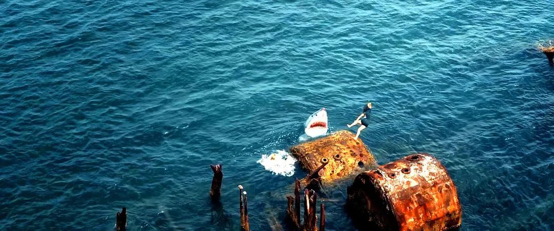 不过,对于那种惊爆眼球的感官大戏,影片也做足了功夫。电影一开始就给观众来了个下马威,本来五人组合都要乘着水陆两用飞机逃出生天了,这时候大白鲨出现了,袭击就在那么一瞬间,飞机的下单翼就废了,人被击翻落水,在水中挣扎的场景就像随时待宰的羔羊,海洋就是大白鲨的地盘,人类在这里啥也不是。说到这里,不得不说影片中有许多水下拍摄的镜头,有从鲨鱼的角度看孤舟的视角,也有第三人从水下向上看鲨鱼和孤舟的视角,可以说是一部真正能让人感觉到与鲨鱼同行的电影。