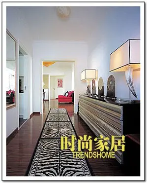 进门处的门廊有非常多的看点,漂亮的台灯、石璧以及延伸到客厅的斑马纹地毯,但最值得关注的是长桌的门板设计——用古典画框一条条叠加做成,非常有创意,有ART DECO的味道,所有这些都是羽西设计的。