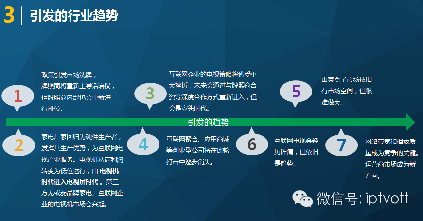 2、电信运营商:无论是叫IPTV还是OTT,基于宽带市场的需求,此类业务必然会成为他们的重心,尤其在宽带的基础带宽提升和市场竞争者(广电、民营)增加的双重挤压下,他们对于IPTVOTT的期望会更高。随着未来IP世界的覆盖,基于电视机的业务,对于他们只是切入口,未来必然是针对家庭的多业务的渗透,电信运营商在这里是有机会的。而这也是他们对于未来的预期。