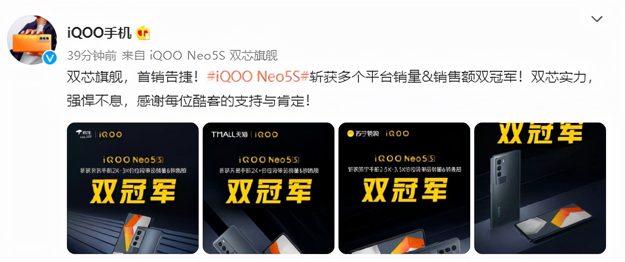 12月24日下午,iQOO官方在社交媒体发文:双芯旗舰,首销告捷!#iQOO Neo5S#斩获多个平台销量&销售额双冠军!战绩傲人。