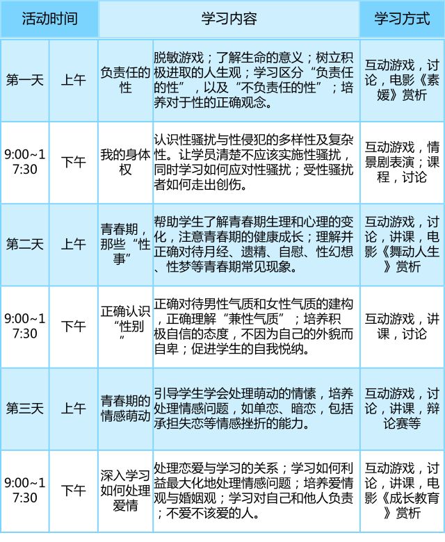 有的孩子不愿意参加,是假定了老师将“教训”他不能谈恋爱等等。一位家长这样对自己的儿子说:“方老师不一样,他是鼓励你们自己决定自己的性和情感。”那男孩子说:“还有这样的老师?好,我报名!”