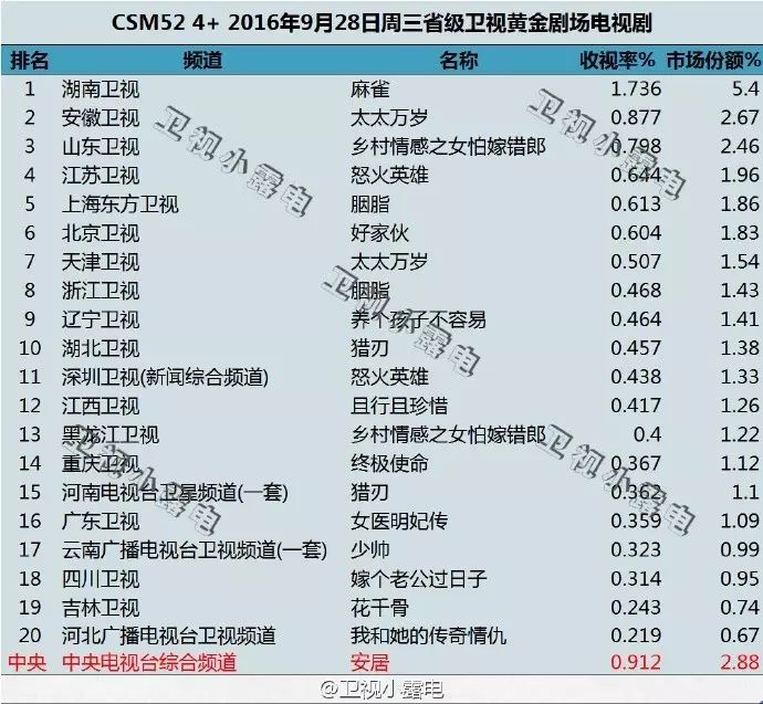 电视剧《麻雀》于2016.9.5在湖南卫视首播,CSM52城市网首播收视率为0.946%,占市场份额2.940%。