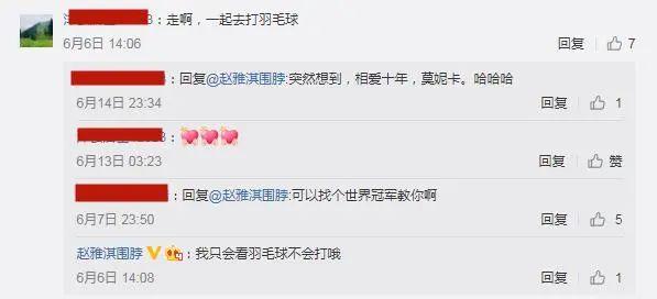 林丹退役后,网友们纷纷跑到赵雅淇的微博评论区刷屏称:“林丹退役了”,在6月份还有网友留言调侃她当年和林丹的出轨事件:“走啊,一起打羽毛球”。