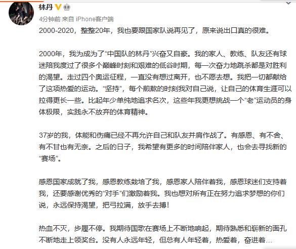 7月4日,林丹发微博宣布退役,“2000-2020,整整20年,我也要跟国家队说再见了,原来说出口真的很难。”同时向所有人表示感恩:“感恩国家成就了我,感恩教练栽培了我,感恩家人陪伴着我,感恩球迷们支持着我,还要感谢优秀的“对手”们激励着我。”