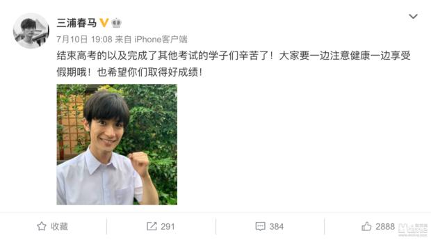 三浦春马的微博有近380万粉丝,近期仍保持活跃,7月10日曾发博为高考学子加油。