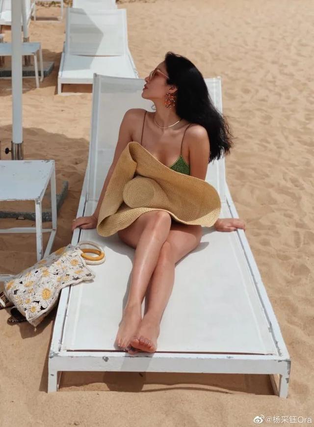虽然草帽遮着胸前,但杨采钰身着清凉比基尼泳装,露出胸前事业线与娇嫩大长腿,还是很火辣诱人的。