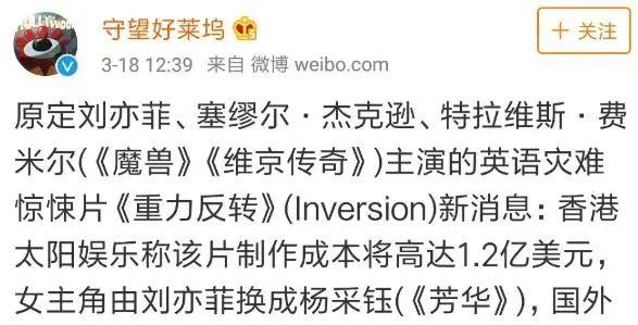 好莱坞电影《重力反转》一开始女主定的是刘亦菲,结果开发布会的时候就变成了杨采钰,估计也是陈金飞帮操作的。