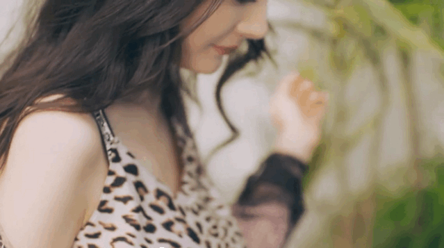 她身穿豹纹露肩吊带裙回眸浅笑,舒适又性感,细腻肌肤若隐若现尽显朦胧之美,化身豹纹小野猫魅力十足。
