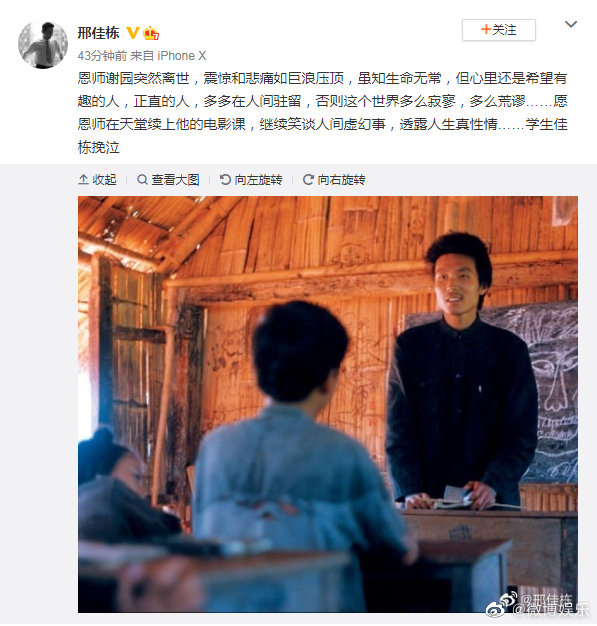 张静初也发短文悼念,“愿谢老师往生极乐一路走好”