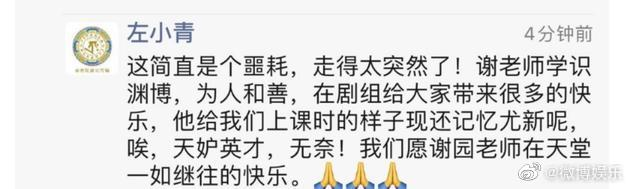 美女红星左小青在上学时候也曾是谢园的学生,两人还在影视剧方面有过合作,她写到:“这简直是噩耗,走得太突然!谢老师学识渊博,为人和善,在剧组给大家带来很多的快乐,她给我们上课时的样子现在还记忆犹新呢。哎,天妒英才,无奈!我们愿谢园老师在天堂一如既往的快乐。”