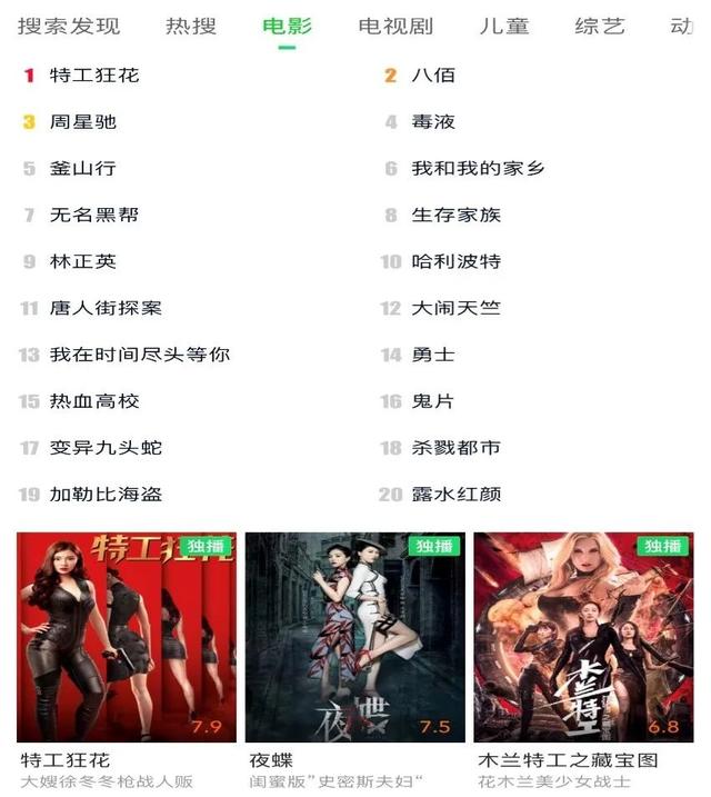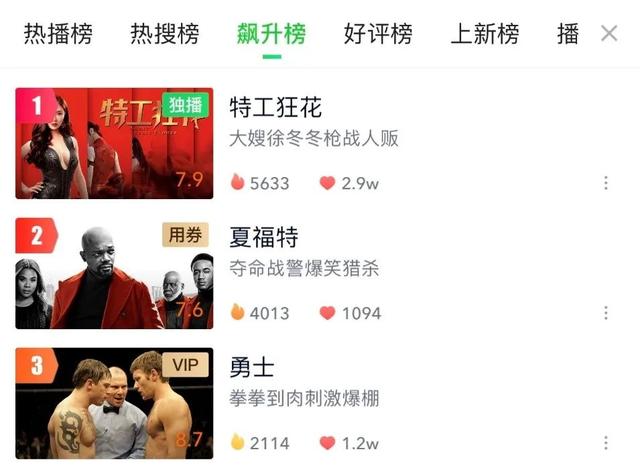 《特工狂花》在爱奇艺网站上榜后,热度迅速冲到影视类第一。因为最近院线的开放,所以近期网络大电影票房不好。毕竟《八佰》数据占据了很多,平台上的电影更显得渺小,《特工狂花》能在爱奇艺网站的电影获得流量第一,爱奇艺网站第4的流量,一个网络的爱你应能有这种热度,真心很不容易。