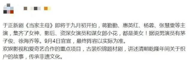 近日于正一部新剧《当家主母》也要开拍了,有消息指出该剧预计在本月初开机并官宣,对于演员的阵容也是令不少网友非常好奇与期待。