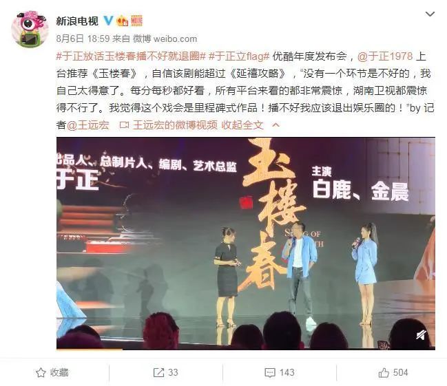早在几天前的发布会上,于正就在台上立下flag,自信《玉楼春》会超过《延禧攻略》,于正表示:“《玉楼春》没有一个环节是不好的,我自己太得意了,每分每秒都好看,所有平台来看的都非常震惊,湖南卫视都震惊得不行了,我觉得这个戏会是里程碑式的作品,播不好我应该退出娱乐圈的。”