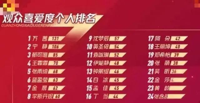 当时,观众喜爱度个人排名看,当红万茜稳居第一,宁静、郁可唯随后,争议最大的是伊能静居然稳居12名稳居中游,而甜姐姐张含韵居然稳居倒数第一,倒数第二则是黄龄,让很多人都质疑里面有猫腻和黑幕!