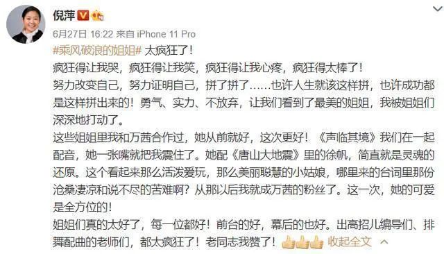 有伊能静、黄圣依这样负责负面的争议,也得有点正能量的姐姐,这个负责人就是万茜,直接被倪萍发微博大赞,“她一张嘴就把我震住了!""那么活泼爱玩...""她是全方位的”