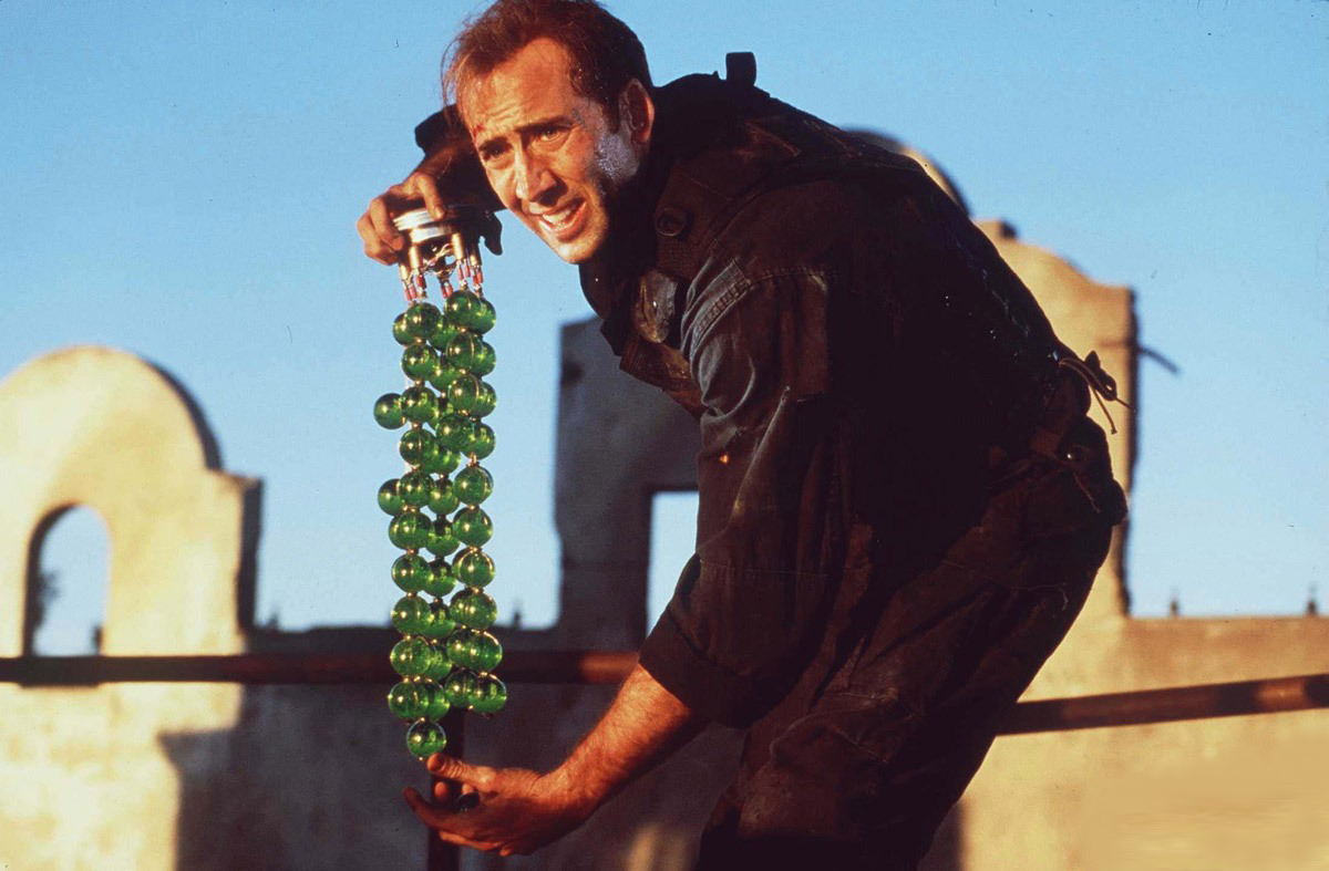 内部像一串葡萄的VS毒气导弹,编剧通过台词专业设计,通俗易懂地介绍其内部构造与危害。凯奇不仅在拆炸弹,还拿一个毒气弹塞进敌人嘴里,顺便给自己打解药的镜头,包括最后拿信号弹阻止飞机炸弹,都拍得命悬一线。