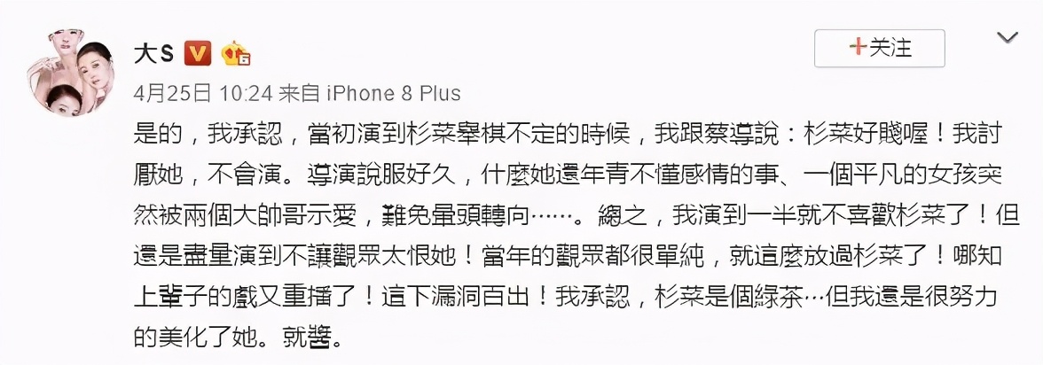 虽然大S肯定属于邻家小美女,不属于国色天香级的角色,但她饰演的杉菜,却很活泼走心,引发观众巨大的轰动与共鸣,堪称她演艺生涯的巅峰之作。