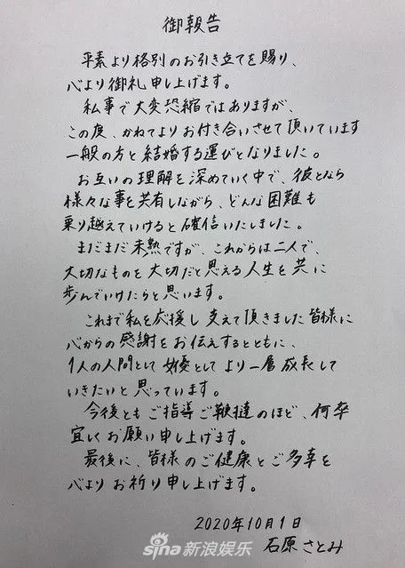 10月1日,石原里美通过所属事务所正式发表了结婚的消息,两人还未同居,预计在年内选择好日子登记,婚礼和婚宴还未定。