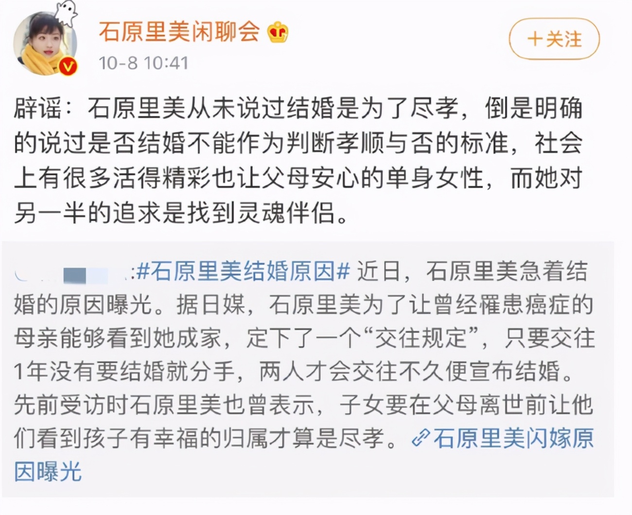 但是,石原里美粉丝团辟谣称石原里美从未说过结婚是为了尽孝“倒是明确的说过是否结婚不能作为判断孝顺与否的标准,社会上有很多活得精彩也让父母安心的单身女性,而她对另一半的追求是找到灵魂伴侣。”