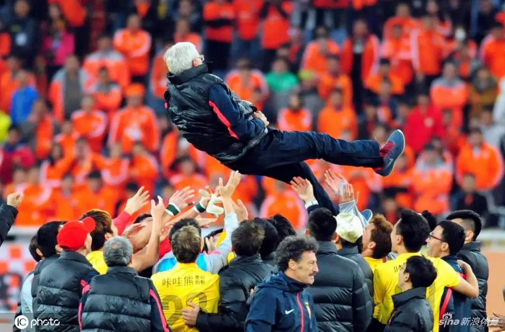 2014年11月2日,山东济南,2014中超第30轮,山东鲁能1-1广州恒大。夺冠后里皮被恒大球员高高抛起庆祝,里皮在广州恒大实现了个人执教中超联赛的三连冠,他也在赛季后辞去了主教练的职务,转为技术总监。
