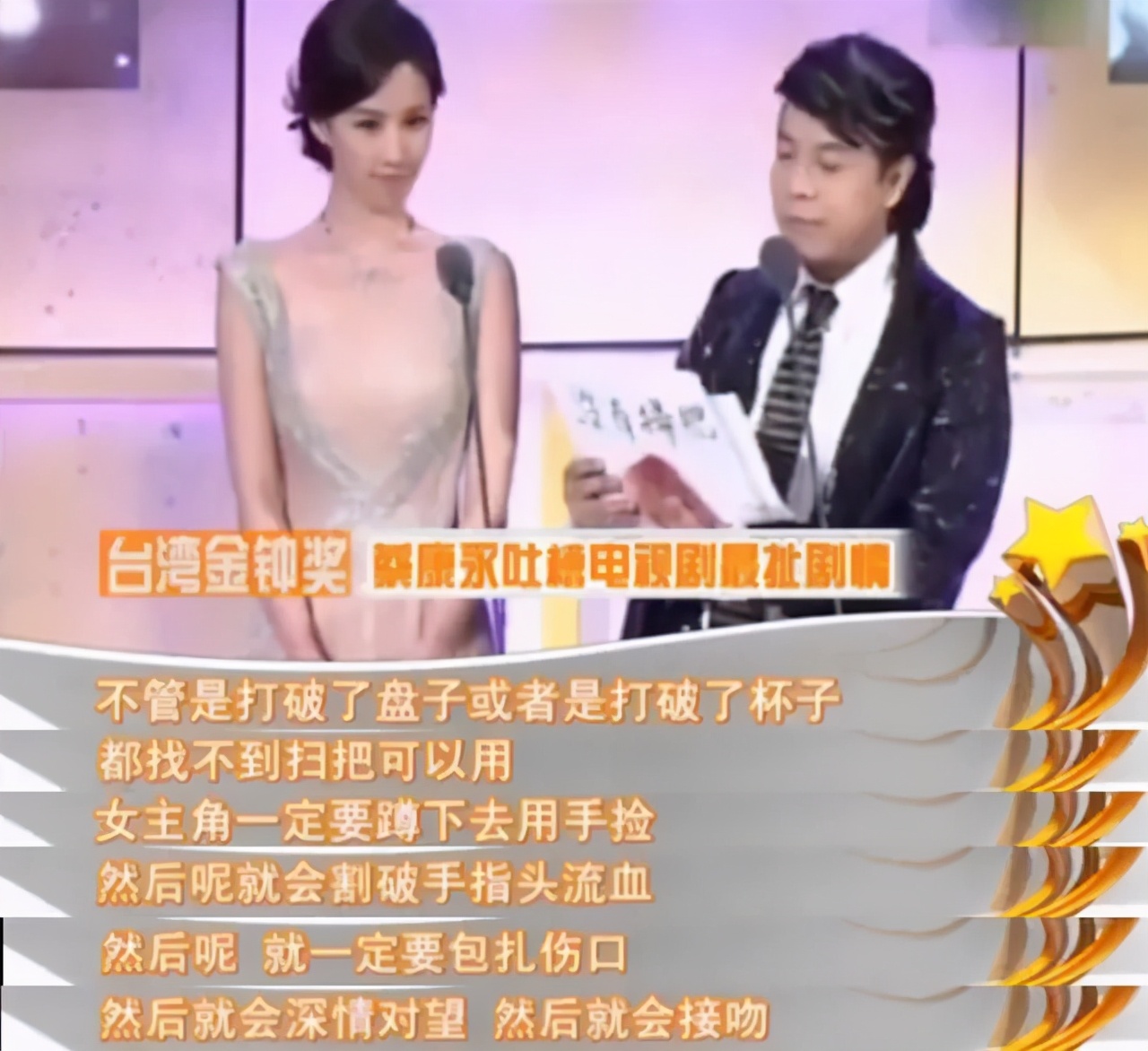 蔡康永就在金钟奖吐槽过“不管是打破了盘子或者是打破了杯子,都找不到扫把可以用,女主角一定要蹲下去用手捡,然后就会割破手指流血,然后就一定包扎伤口,然后就会深情对望,然后就会接吻。”