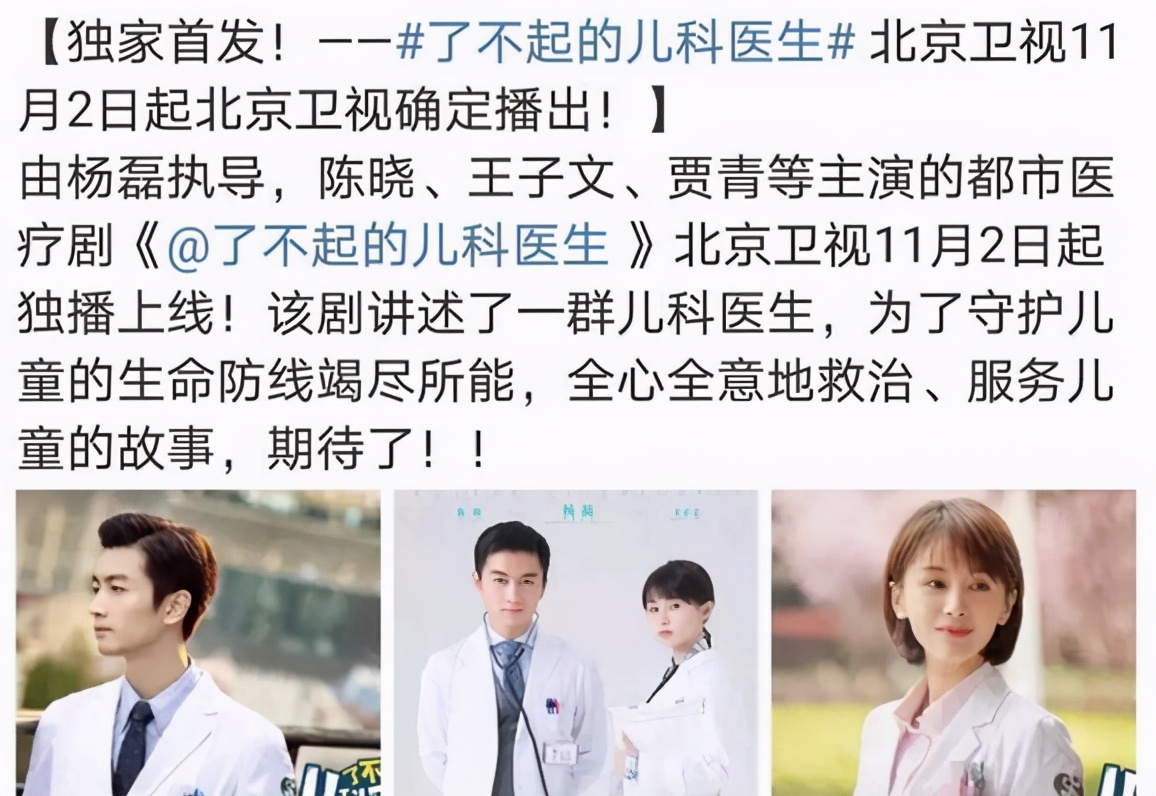 结果,在10月快结束的时候网友却突然发现,北京卫视11月2日开始播出的电视剧是一部都市剧《了不起的儿科医生》,由陈晓,王子文,贾青主演。这部剧在去年的时候就被推荐为建国70周年献礼名单,排档也等了很久。