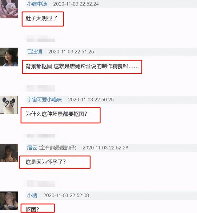 不少网友吐槽说:“肚子太明显了”“背景都抠图,这就是唐嫣粉丝说的制作精良吗”“为什么这种场景都要抠图”“这是因为怀孕了?”“抠图?”“这是已经显怀了”“这是她怀孕时拍的吧”“双下巴也很明显孕味十足,演员怀孕了还是安心休假吧对自己和观众负责”。