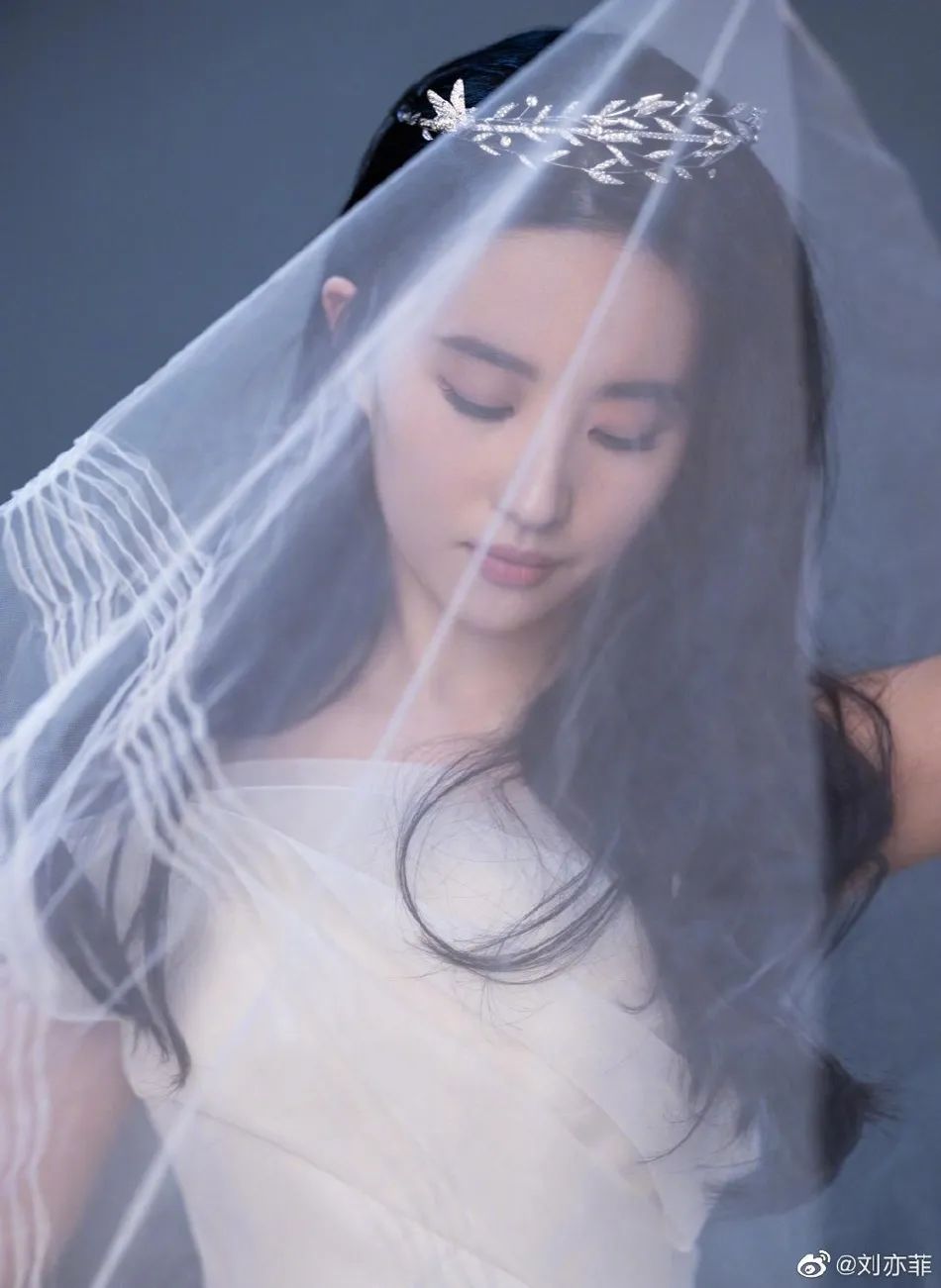 刘亦菲一身飘逸梦幻的白色纱裙,头戴叶子造型的皇冠,头发也打理成更加柔和妩媚的卷发,更像一位气质高贵优雅的公主,刘亦菲微微低着头,白纱拂面、睫毛弯弯、五官精致,这画面简直就是颜粉理想中的仙女图。