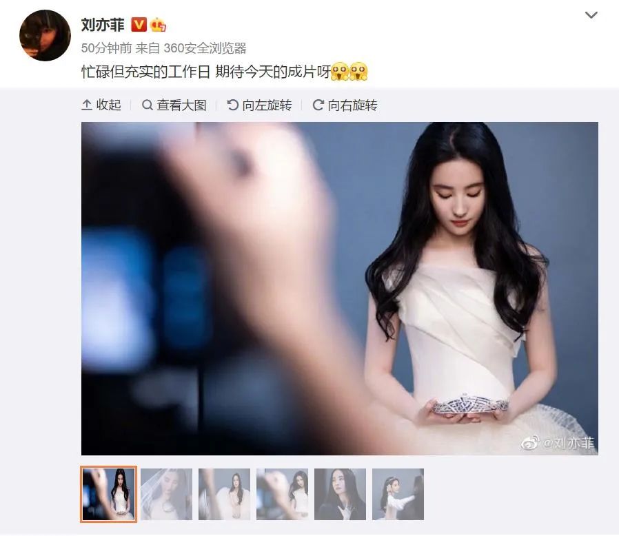 12月4日,刘亦菲微博晒出一组工作照,头戴皇冠,面覆轻纱,一袭白色礼服,宛若公主;西装造型气场十足,又似电视剧中的财阀大小姐。