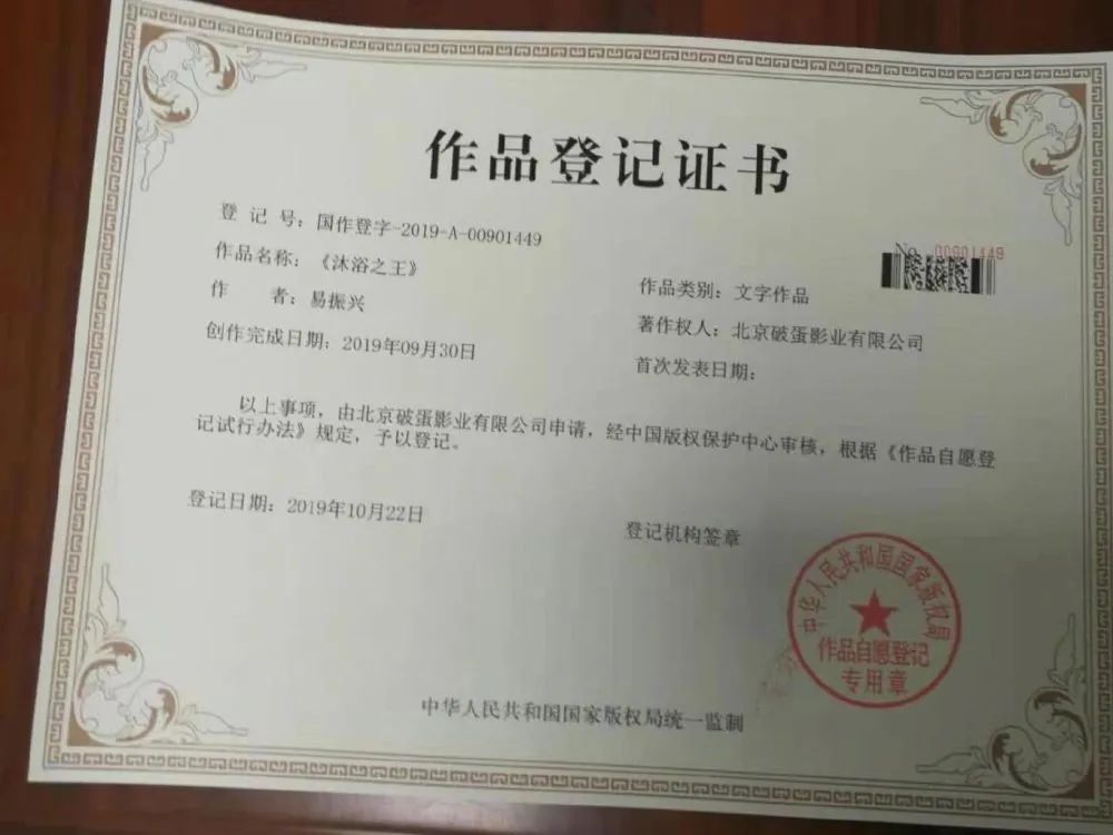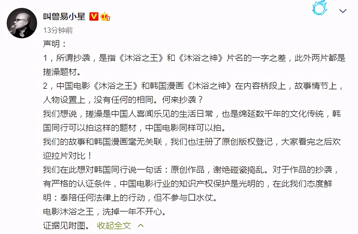 最后喊话韩方道:原创作品,谢绝碰瓷捣乱!并晒出了《沐浴之王》的原创版权登记证。