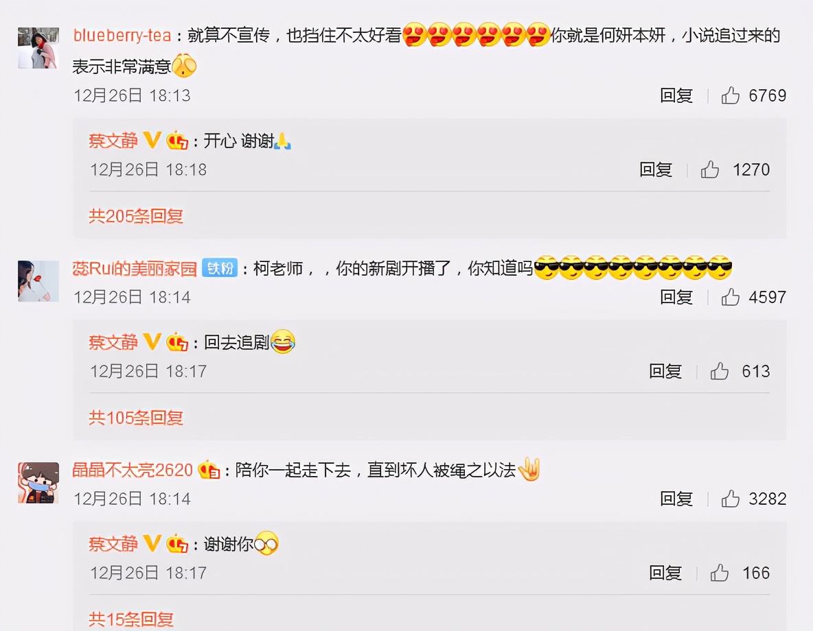 不过,女主角蔡文静还是在微博回复上同网友进行互动,她面对网友赞美,表示很开心,还准备回去追剧!
