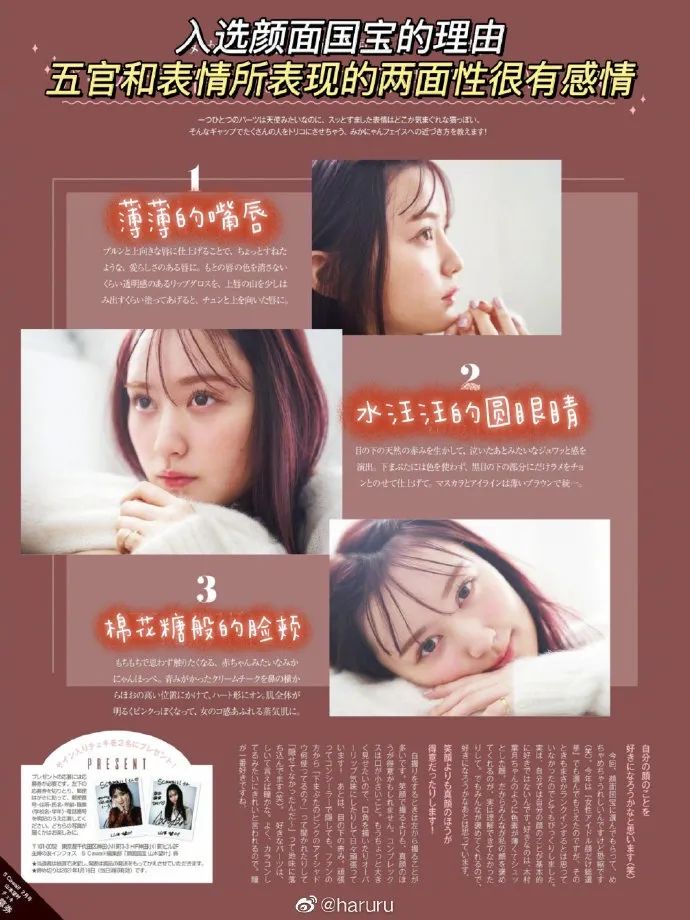 该杂志给出山本望叶入选颜面国宝有三大理由:一是她薄薄的嘴唇,二是她水汪汪的圆眼睛,三是棉花糖般的脸颊,足见她魅力不俗。