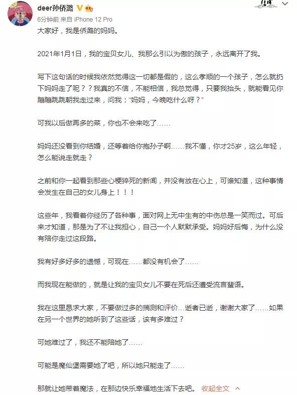 孙妈妈发文提道:“之前和你一起看到那些心梗猝死的新闻,并没有放在心上,可谁知道,这种事情会发生在自己的女儿身上!”她还恳求网友,不要做过多的揣测和评价:“逝者已逝,谢谢大家了……如果在另一个世界的她听到了这些话,该有多难过?”
