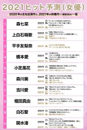 2020年,她一口气接下了《再见~从谎言开始的人生喜剧~》《帕累托的误算:社会福利机关调查员杀人事件》《35岁的少女》《阻止我》等影视剧,所以预测她会在2021年人气爆发。