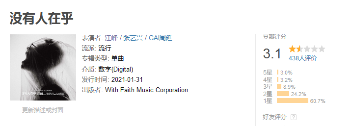 豆瓣上,汪峰新歌评分稳居3.1,跟他昔日《信仰在空中飘扬》《怒放的生命》《花火》《春天里》稳居8分,甚至9分的高度评价,已经形成鲜明对比!