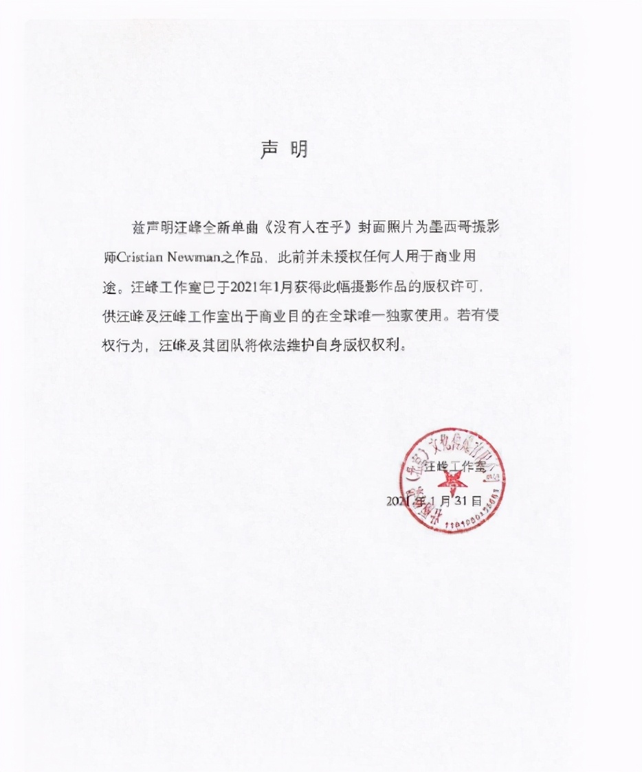 随后,汪峰微博发布了《汪峰工作室对于作品〈没有人在乎〉版权声明》,声明称汪峰新歌《没有人在乎》的封面为墨西哥摄影师Cristian Newman的作品,此前并没有授权任何商业用途,汪峰工作室已于2021年1月获得此幅摄影作品的版权许可,供汪峰及汪峰工作室出于商业目的在全球唯一独家使用。若有侵权行为,汪峰及其团队将依法维护自身版权权利。