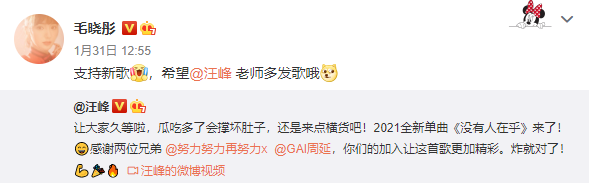 但是,汪峰的新歌还是要发的,头条还是要抢的,《没有人在乎》刚发布不久,除了几位主创人员互动宣传外,转发区还出现了一位新面孔,就是抢了汪峰热搜的毛晓彤。