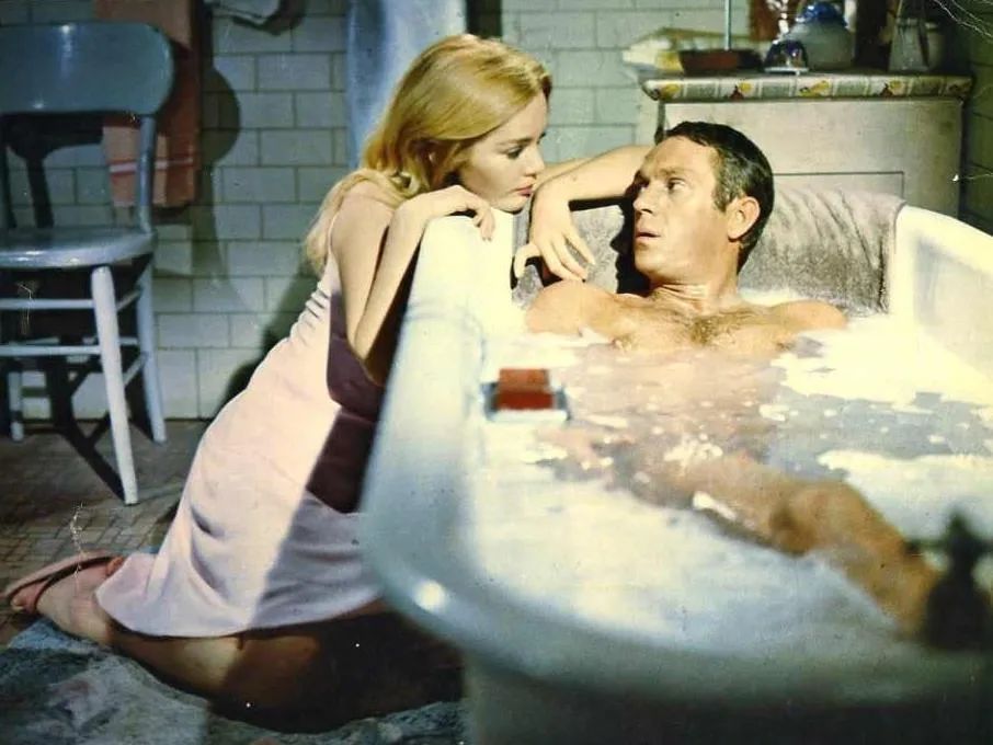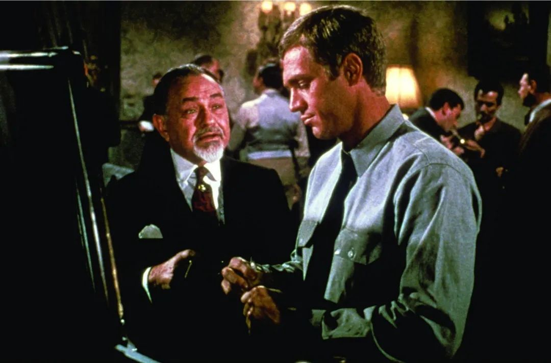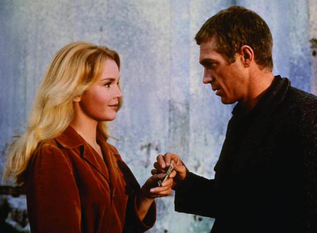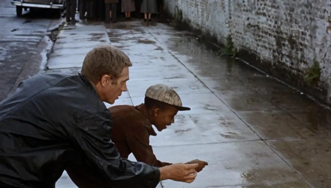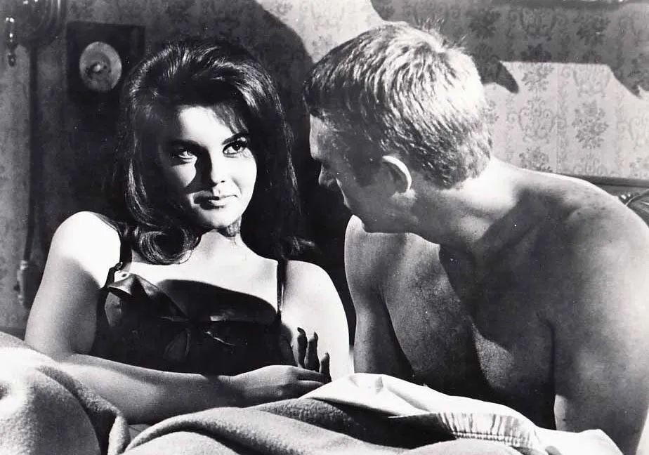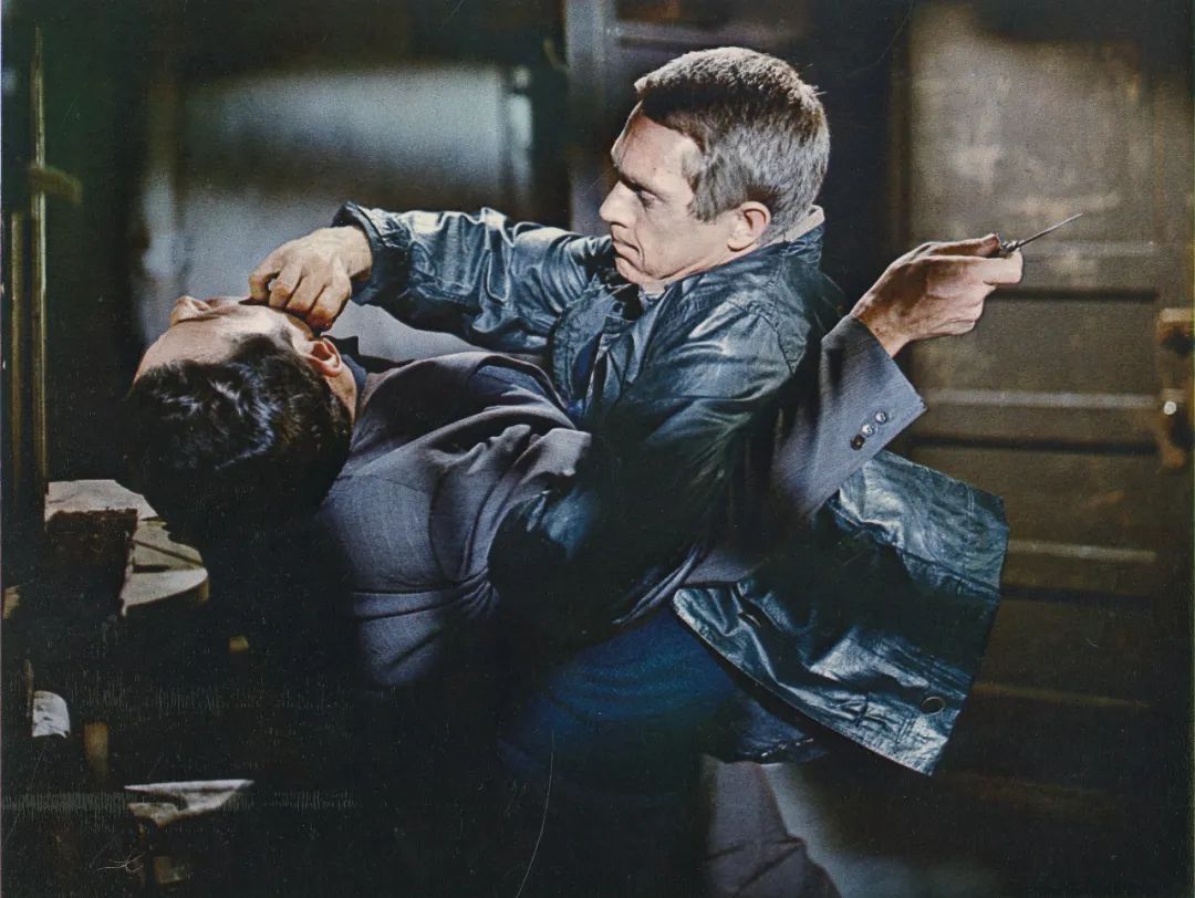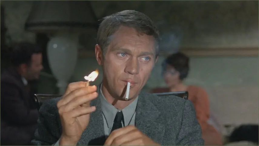 史蒂夫·麦奎因和赌场流氓一场打斗之后逃离火车站,口琴演绎的主题音乐隐约有十年后日本经典电影《追捕》的影子。每个赌场都是都是烟雾缭绕,酒气熏天,各种肉感的美女围绕,也营造出烟酒赌色的不俗气氛。