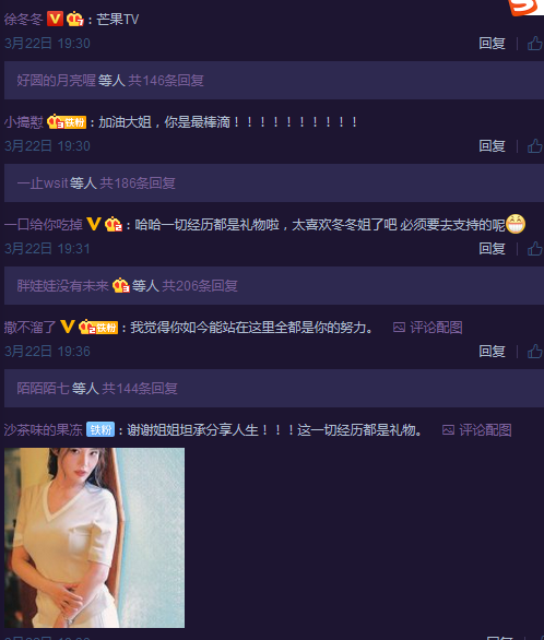 网友听说徐冬冬加盟《听姐说》后,也纷纷发表赞美:“加油大姐,你是最棒滴!!!!!!!!!!”、“一切经历都是礼物啦,太喜欢冬冬姐了吧 必须要去支持的呢”、“我觉得你如今能站在这里全都是你的努力。”