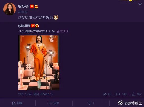 针对加盟《听姐说》这档综艺节目,徐冬冬也发微博:感恩所有标签,让我可以站在台上,跟17个优秀又真诚的女人一起,坦诚分享人生。过往一切经历,都是礼物。