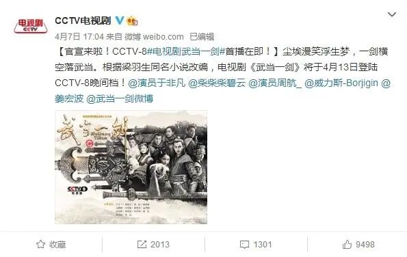 时间回到4月7日傍晚,官方微博发布新闻,根据梁羽生同名小说改编的武侠大剧《武当一剑》定档,从4月13日起,晚间九点半正式首播。