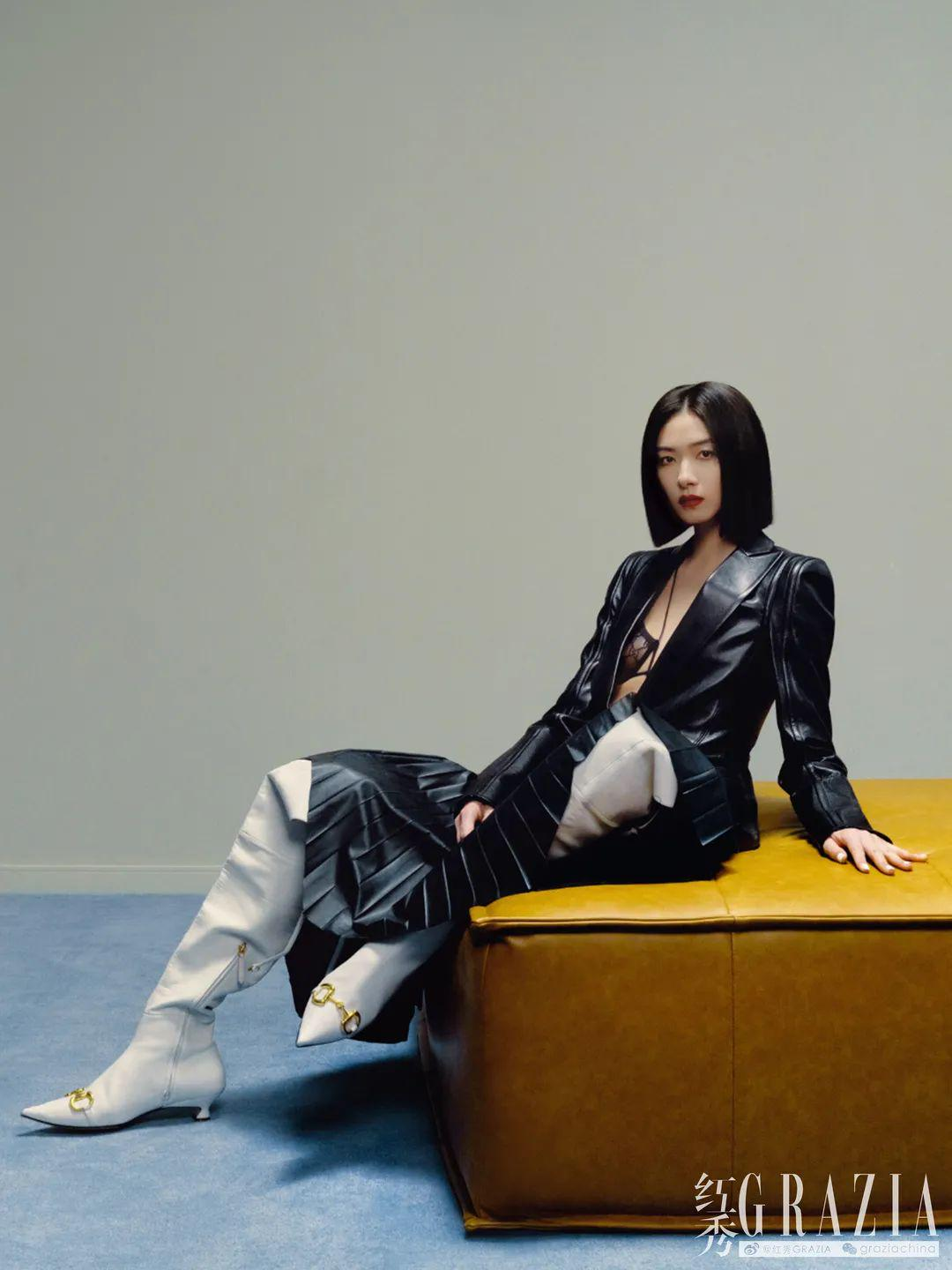 带着这样的解读与理解,万茜在与红秀的合作拍摄中表现出独有的特定气质。弹力平纹布连体紧身衣搭配鳗鱼皮高腰钟型裤,再加上方形耳环的点缀,万茜帅气的坐姿在光影中展现出强烈的视觉观感。