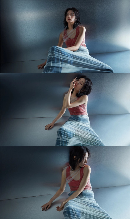 在另一组照片中,万茜身穿红色修身半透视针织背心,石磨色中腰牛仔裤被套上白色羽毛下摆透视连身裙,裙子的线条犹如茧丝或是光线,在多重光影的幻境中有一种破茧成蝶跨越时间既视感。