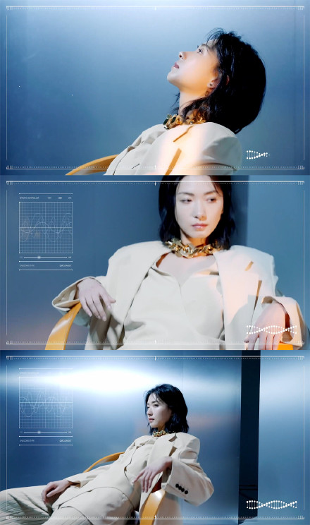 近身镜头中万茜身穿水蓝色棉质针织衫,钯金及金色别针耳环在发隙中若隐若现,黑色皮革喇叭裤配合动感光线叠影,科技感十足。
