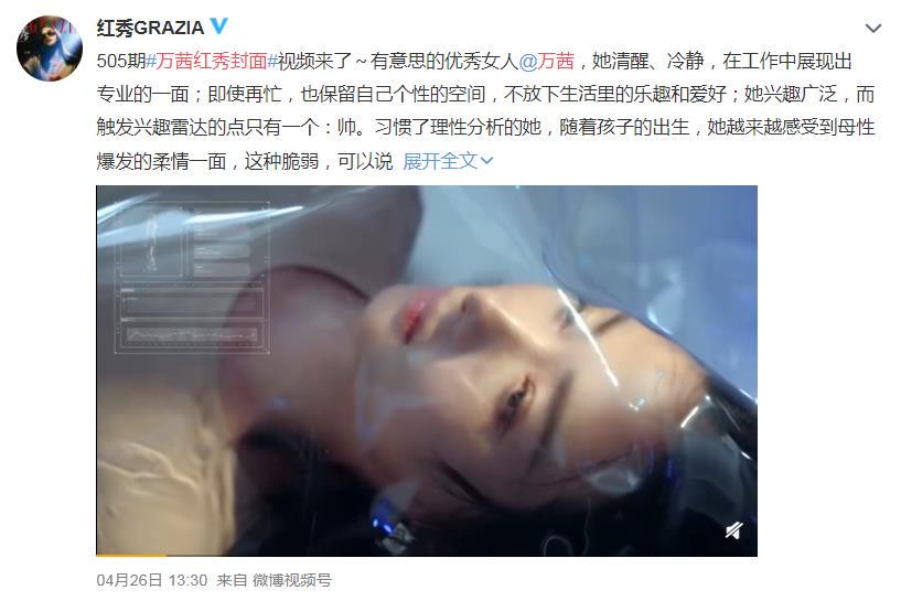 4.26日,万茜红秀GRAZIA新期封面曝光,此次拍摄的写真是赛博朋克风格。红秀官方发出的视频中,万茜身穿亮片迷你裙、紧身连体衣,在红绿亮光交织的空间中,给人一股冷冽凌厉的气场。