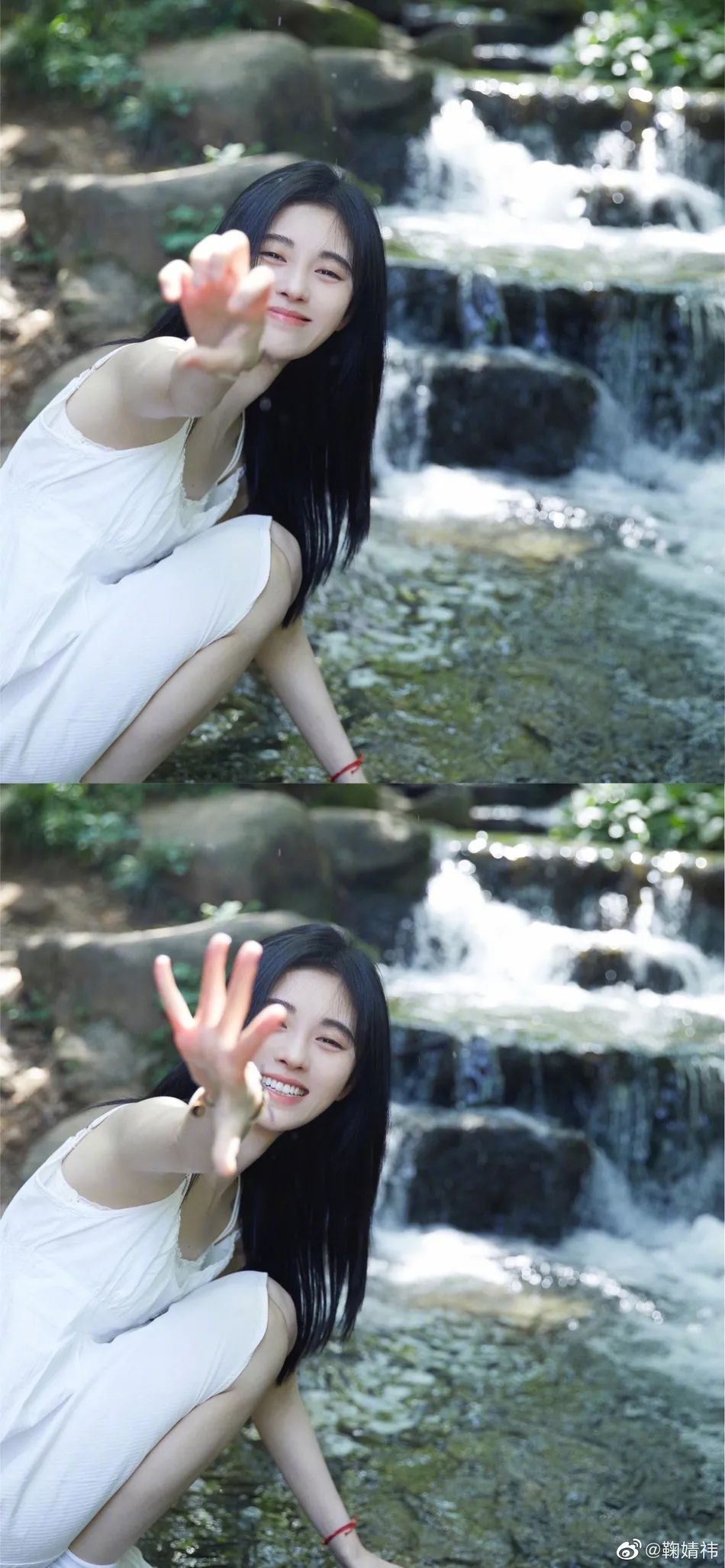 鞠婧祎蹲坐在小溪边,一只手玩弄着水花,另一只手伸向镜头,她笑得很甜美,唇红齿白,满脸都是胶原蛋白,真是美得让人心动啊!