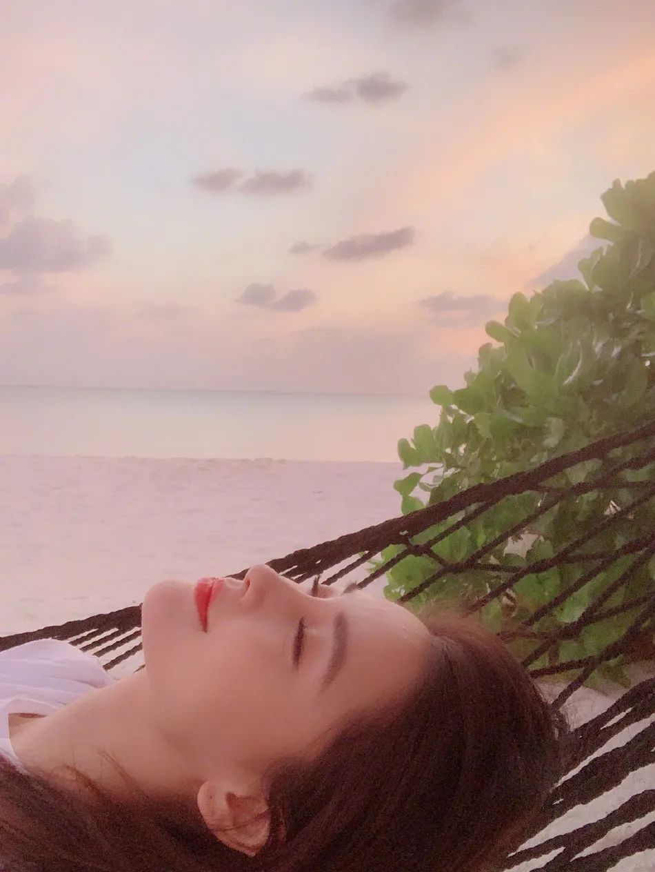 杨颖穿着吊带花裙子,俏脸妩媚,烈焰红唇,她单手托着下巴,还是很性感迷人的。