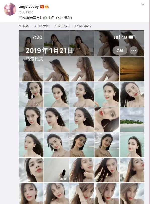 5月21日,angelababy微博发布50张两年前自拍,张张不重样,但每一张都肤若凝脂,笑容灿烂,大写的美!网友纷纷表示这个521福利太赞了~